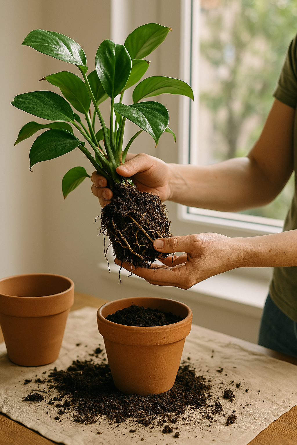 - 식물을 천천히 화분에서 꺼내기 – 줄기 흔들지 말고 화분을 두드려 분리