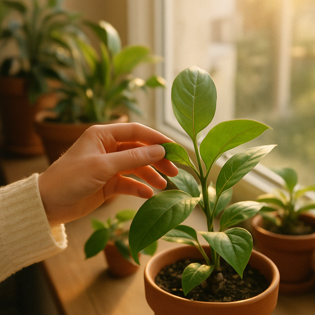 아침에 일어나 식물에게 인사하고, 물을 주고, 잎을 살펴보며 하루를 시작하는 시간.